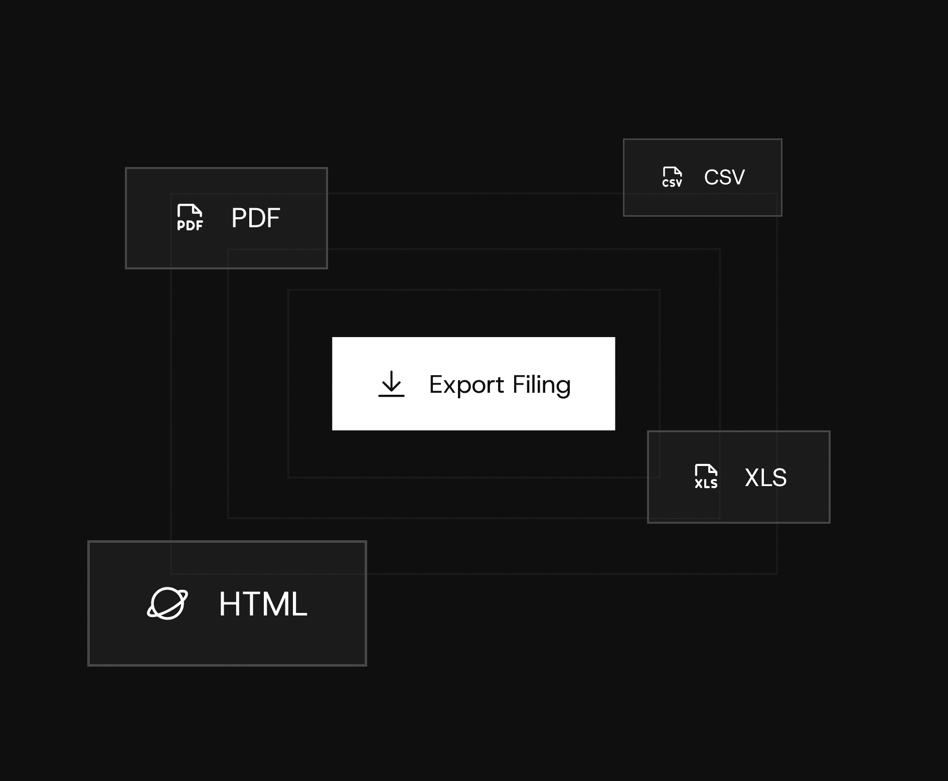 Export data and documents in the formats that work best for you. Download filings in PDF, or pull structured data and reports in Excel or CSV format for external analysis and integration into your internal models and systems.